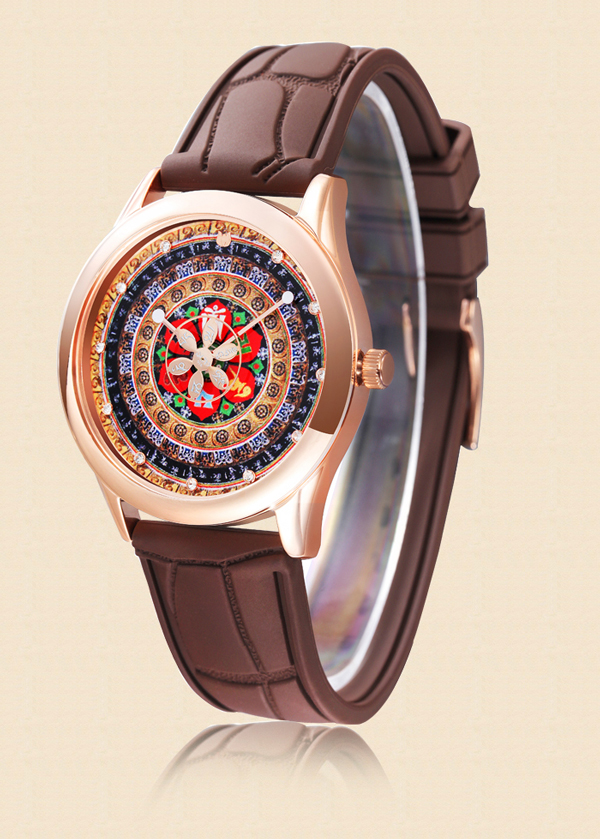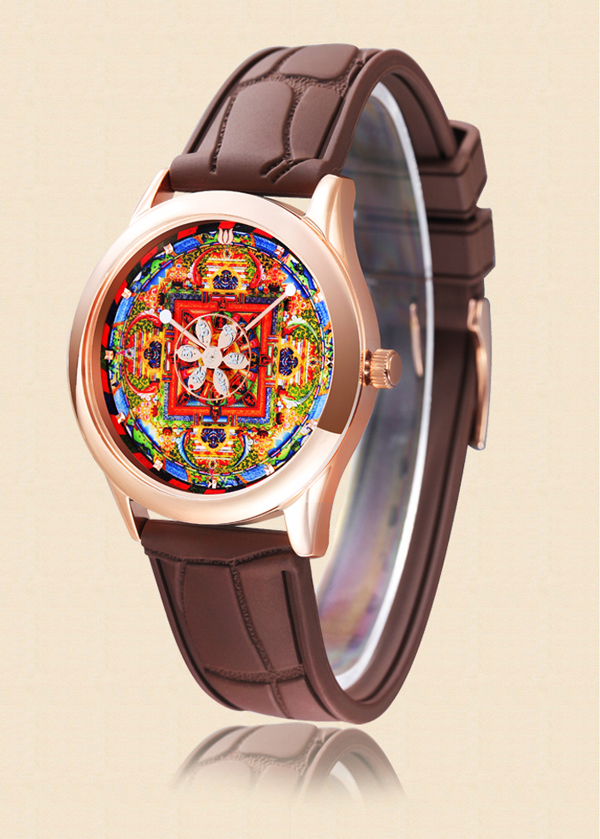佛教文化-觀音壇城手表:羅是梵文的音譯,意思是壇城,藏語稱作"吉廓"。曼陀羅源于古代印度的密宗修法活動,那時的人們為了防止"魔眾"的入侵,修密法時就在修法場地修筑起一個圓形或者方形的土壇,在土壇上修法,邀請過去、現在、未來諸佛親臨作證,并在土壇上繪出他們的圖像,由此構成了后世壇城的基本框架,演變出多種形式和類別的曼陀羅。壇城作為象征宇宙世界結構的本源,是變化多樣的本尊神及眷屬眾神聚居處的模型縮影。