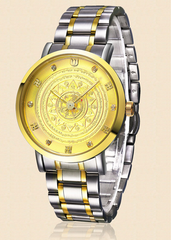 佛教文化-六字真言手表:六字大明咒分別為:唵、嘛、呢、叭、咪、吽,每個字所代表的意義都是不同的,但是每個字都代表無盡功德大利,即使你只修念其中一兩個字,也會得到很大功德。佛教認為,若此真言著于身、觸于手、藏于家,或書于門,皆得逢兇化吉,遇難呈祥,一切所求,無不滿足。