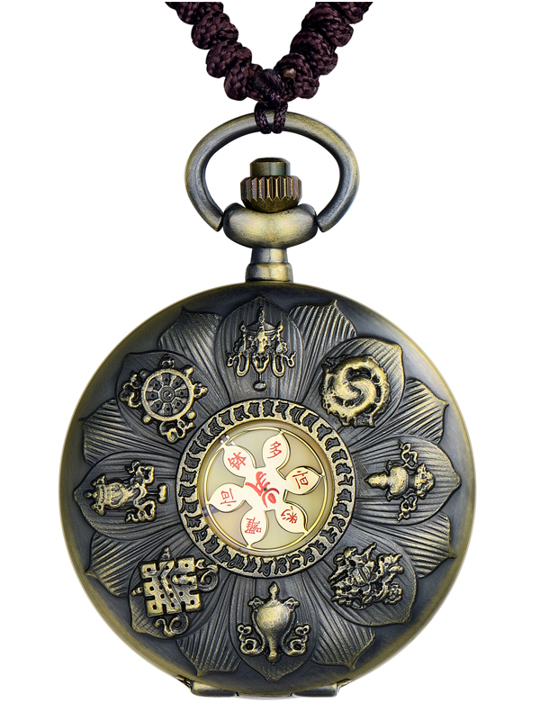 佛教文化-楞嚴咒佛緣懷表:表殼上刻有八吉祥圖,最核心層用梵文“嗡”,次層用“悉怛多缽怛羅”楞嚴咒,三層用五大咒心,外層用34個梵文楞嚴咒咒心,顏色上也有殊勝法味,梵文楞嚴全咒裝藏在懷表里。大佛頂首楞嚴神咒,此咒有大威力,放大光明,能以佛之凈德覆蓋一切,以白凈大慈悲遍覆法界,有不可思議之大威德,持此咒的人,能退避一切怨敵,摧毀一切邪巫詛咒,避免一切災難橫禍,能降伏一切天魔外道,消除一切奇難雜癥惡疾。又可避免一切地水火風空、刀兵、星變、饑饉、牢獄、魔類、冤仇、疾病等災。所求諸愿,悉能成就,求子,求長壽,等等。持誦此咒的人,常得日月星斗歡喜擁護,大降吉祥,逢兇化吉。命終之后,十方國土,隨愿往生。