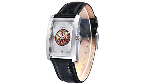 表盤刻有壇城圖案,秒輪是由轉經輪演化而來的,四周刻在六字真言。刻有六字真言的秒輪在壇城上右旋,等同于持誦六字大明咒功德,象證著最終的目標即修成正果……
