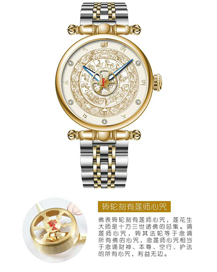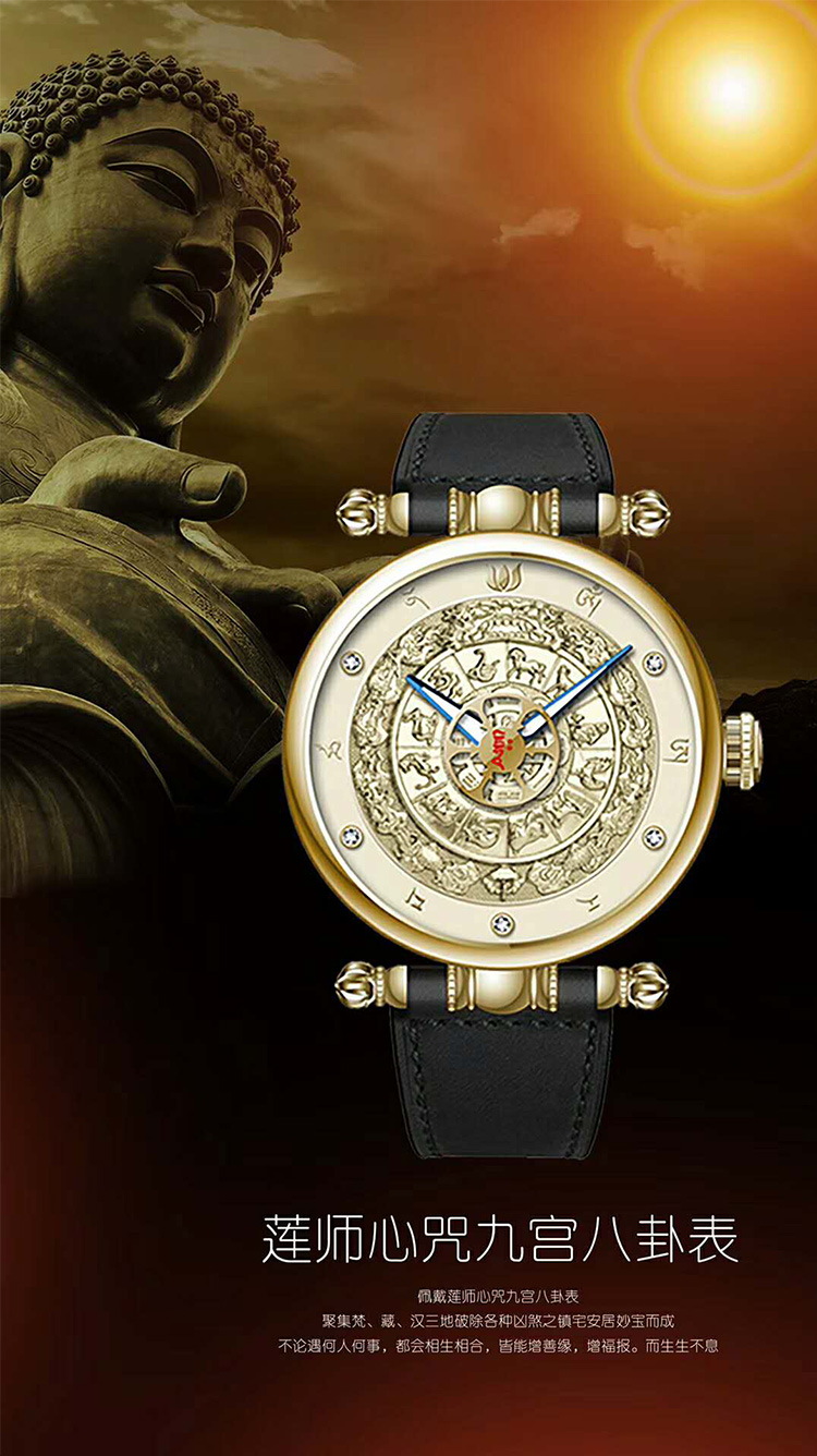 如意輪文化手表又出新款了-----蓮師心咒九宮八卦表。此表將蓮師心咒,九宮八卦牌與金剛杵融為一體,九宮八卦牌可以使每個生肖的人相生相合,蓮師心咒法輪的轉(zhuǎn)動可以凈化人的心靈,使人平靜,并達(dá)到祈福的作用。而且在某種意義上賦予了它生命力,讓它與佩戴者形成了無形且更加緊密的聯(lián)系,腕表順時針轉(zhuǎn)動的時候,就像佩戴者本人默念蓮師心咒,寓意一切有情眾生吉祥如意,平安健康,神足財手。