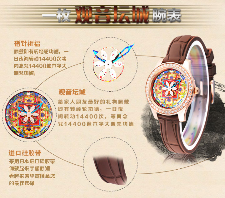 著于身、觸于手、藏于家可逢兇化吉,遇難呈祥;表芯無始無終轉動不息,威力無比;時光與佛法律動,分分秒秒佛佑相伴。一切所求,無不滿足。